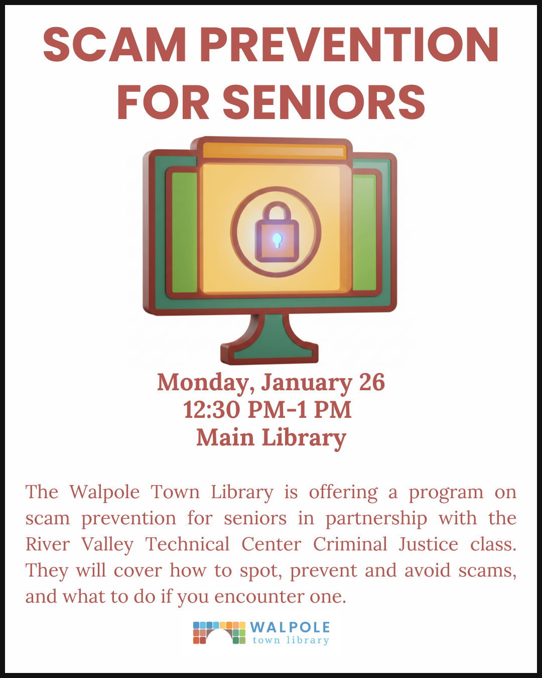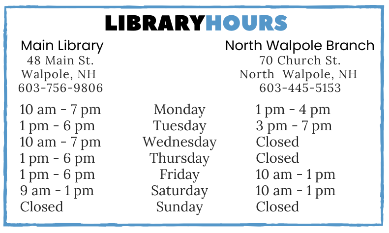 Walpole Town Library JANUARY NEWSLETTER (use your zoom in/out) 24/7 RESOURCES LIBRARY BROCHURE Facebook Instagram YouTube FOR ADULTSFOR KIDS & FAMILIES New at the Library! Share this: Share on X (Opens in new window) X Share on Facebook (Opens in new window) Facebook Like Loading...