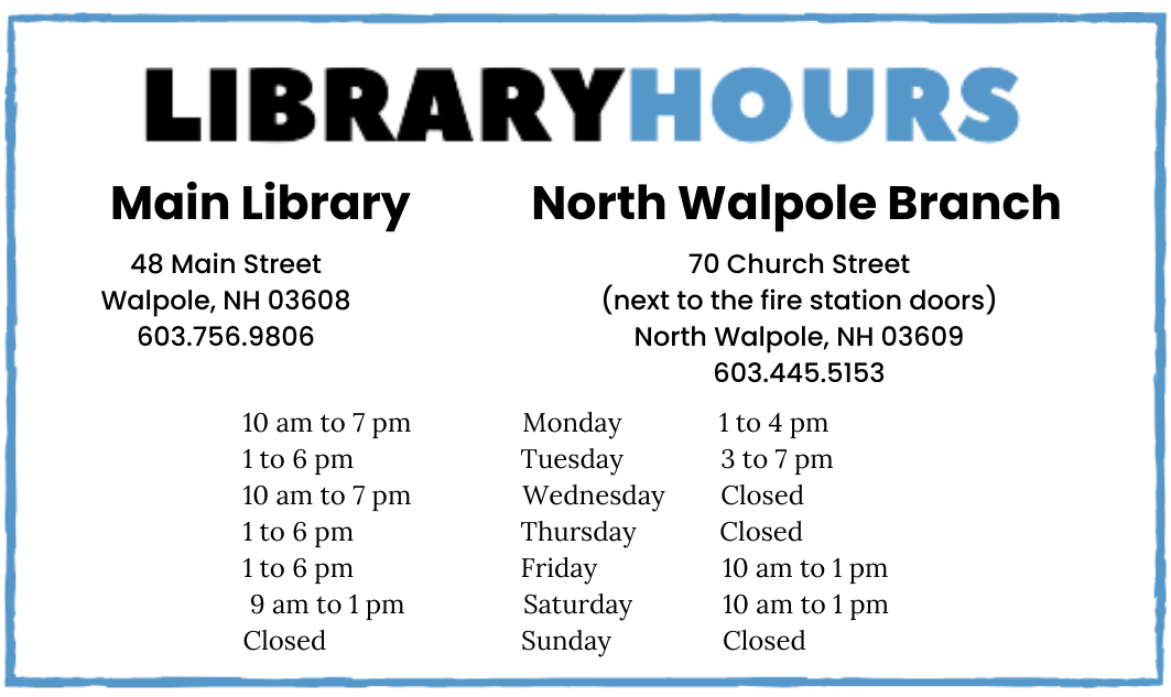 Walpole Town Library FEBRUARY NEWSLETTER (use your zoom in/out) 24/7 RESOURCES LIBRARY BROCHURE Facebook Instagram YouTube FOR KIDS & FAMILIES New at the Library! Share this: Share on X (Opens in new window) X Share on Facebook (Opens in new window) Facebook Like Loading...